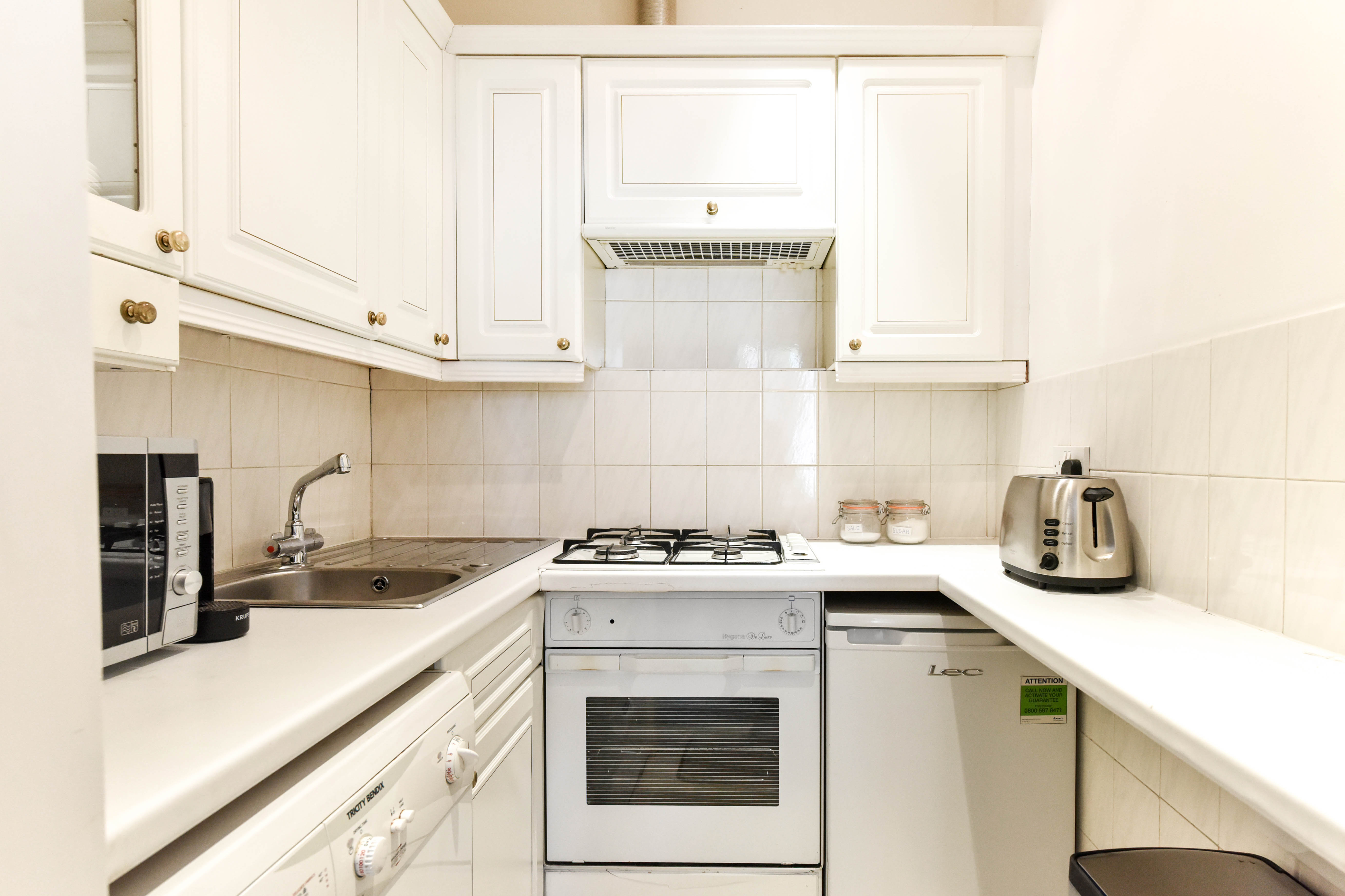 It could not have been better. The flat is located in a building at the end of a very quiet cul-de-sac that opens onto Brompton Road. The nearest tube station (Knightsbridge, on the Piccadilly line) is an easy 10-minute walk, and is right next to Harrod’s. Brompton Road has lots of shopping, from Harrod’s and Harvey Nichols to Boots, and small versions of Waitrose and Sainsbury for groceries. The layout of the flat itself, and its amenities. While tiny by US standards, the kitchen is updated and has everything necessary to prepare meals. There’s also a washer/dryer. The living/dining area is spacious. The bedroom is small but still has two closets and a chest of drawers. The bathroom has also been updated and has a large tub/shower.