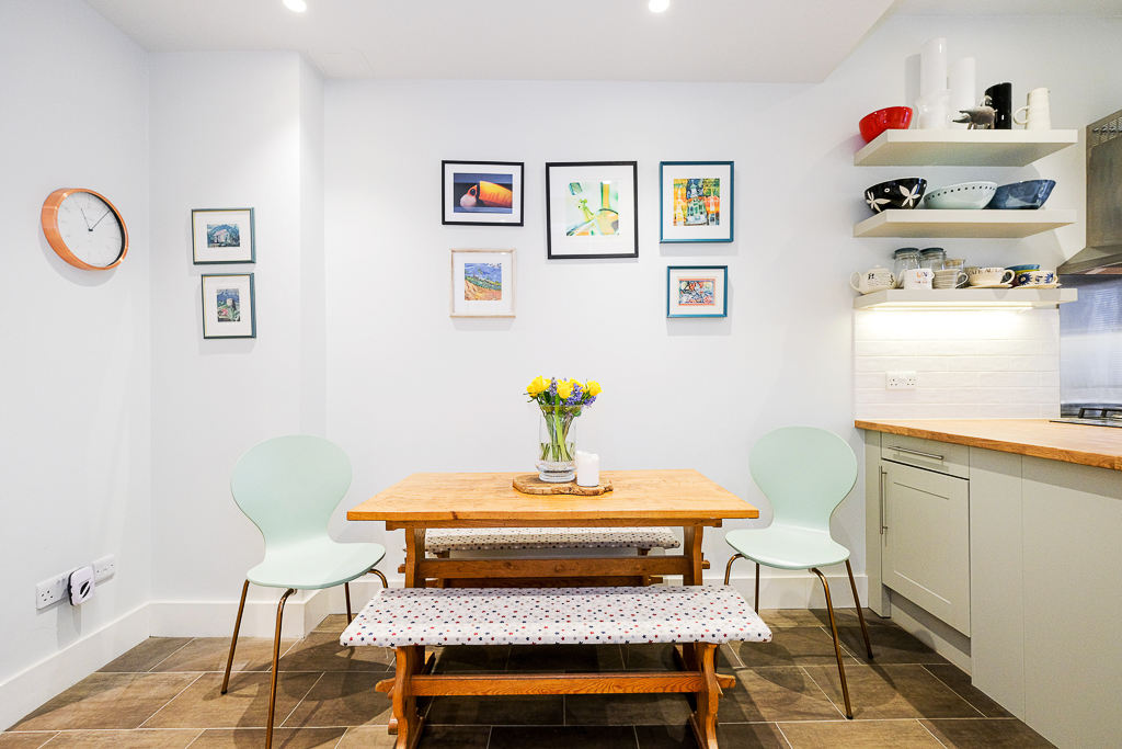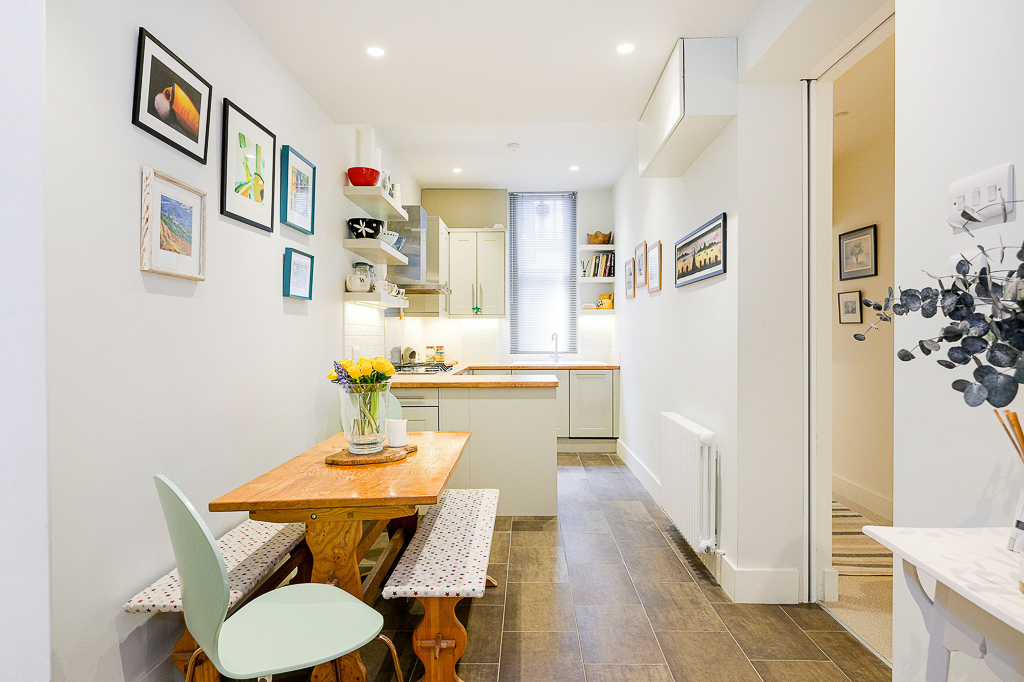 As you make your way through the home you will notice the light and airy neutral palette. To your right awaits a well-equipped kitchen, fitted with all necessary appliances for home cooking and a generous dining table. To your left you will find access to the leafy communal garden, perfect for a morning coffee, via the tastefully furnished living room.