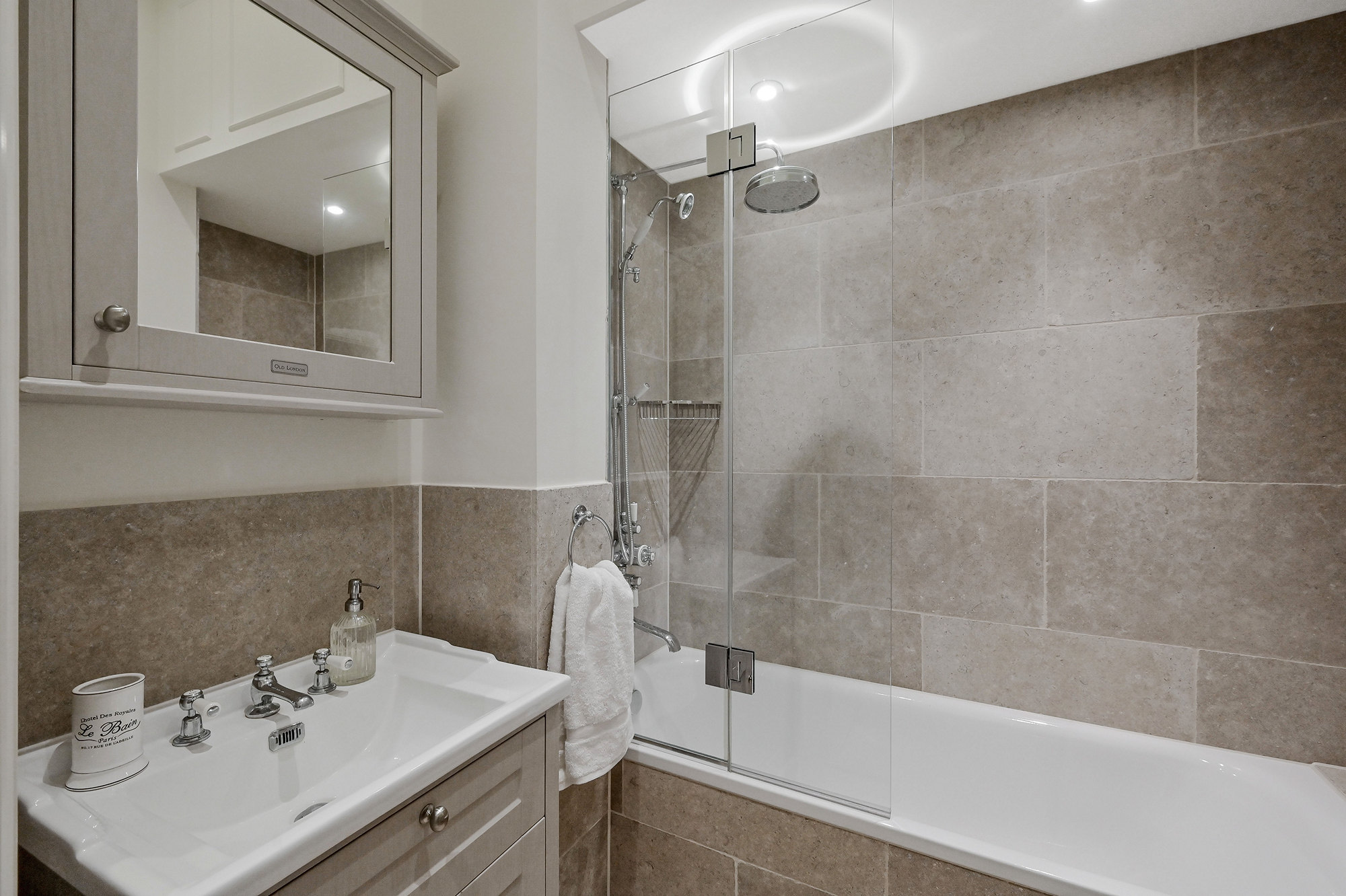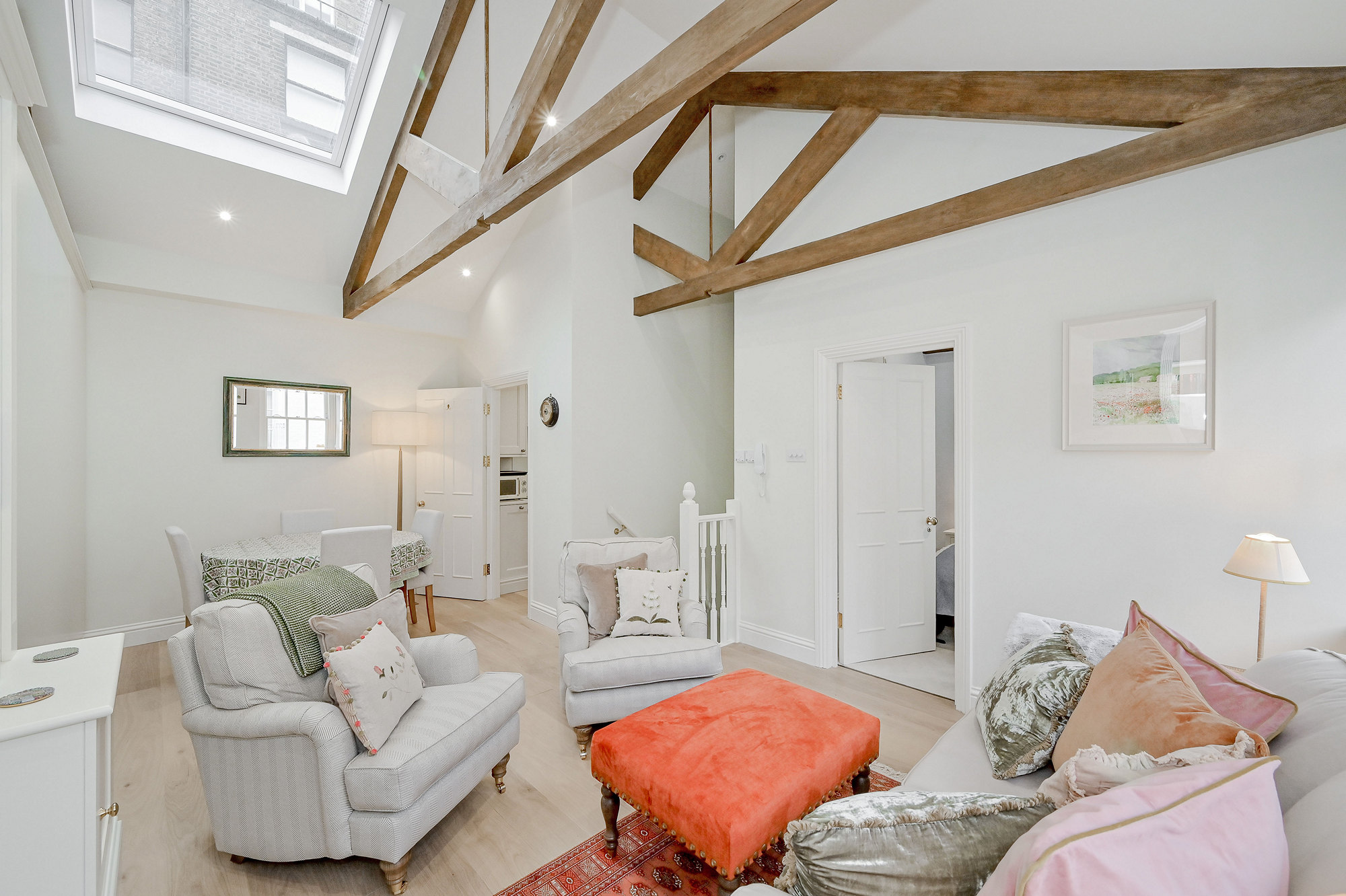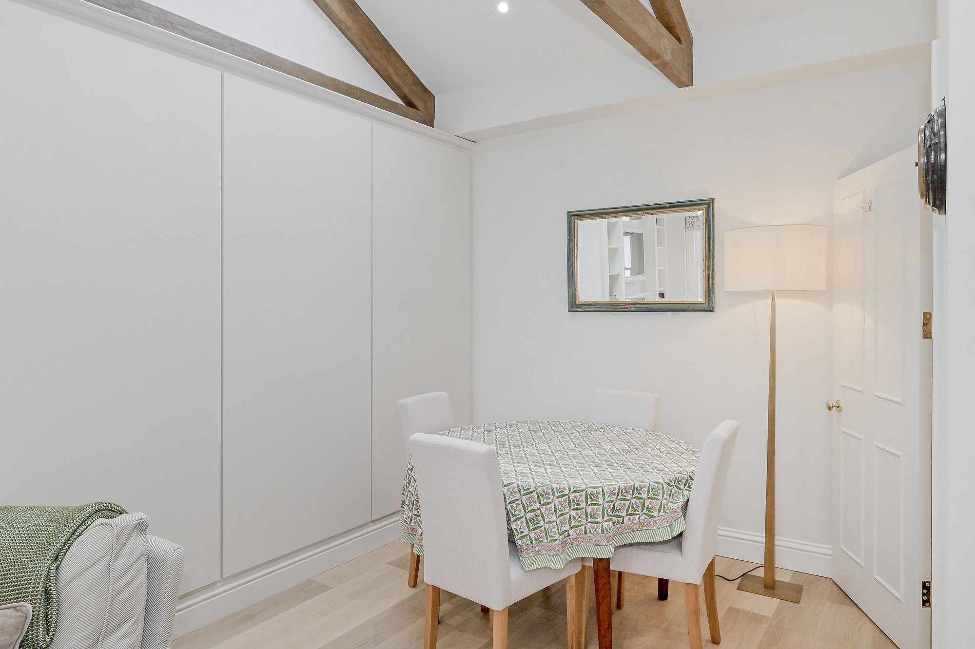 Situated in a quintessential cobblestone mews, this home is arranged across the ground and first floors, connected by internal stairs. The first floor features a bright and cosy living and dining room, served by a fully equipped kitchen. The principal bedroom on this level offers a UK king-sized bed (5 ft wide), an ensuite bathroom with a shower stall, and access to a small balcony. On the ground floor, the second bedroom boasts UK twin single beds (3 ft wide each) that can be configured as a double, as well as an ensuite bathroom that has a shower over the bath and a dressing room. For added convenience, the home also includes a secure single-car garage.