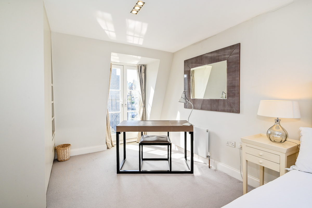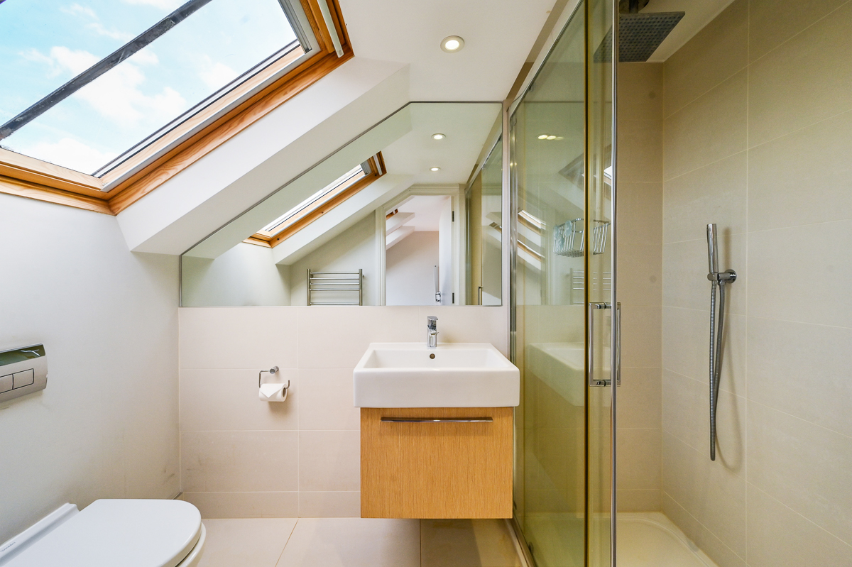 On the first floor, you’ll find a charming single bedroom (3ft wide), served by a separate bathroom with a shower-over-bath. The elevated master bedroom boasts a luxurious UK super king-sized bed (6ft wide) and a sleek ensuite bathroom with a shower stall and bathtub. On the top floor, two further king-sized bedrooms (5ft wide) await, one of which enjoys the added luxury of terrace views, skylights, a dedicated workspace, and an ensuite shower room.