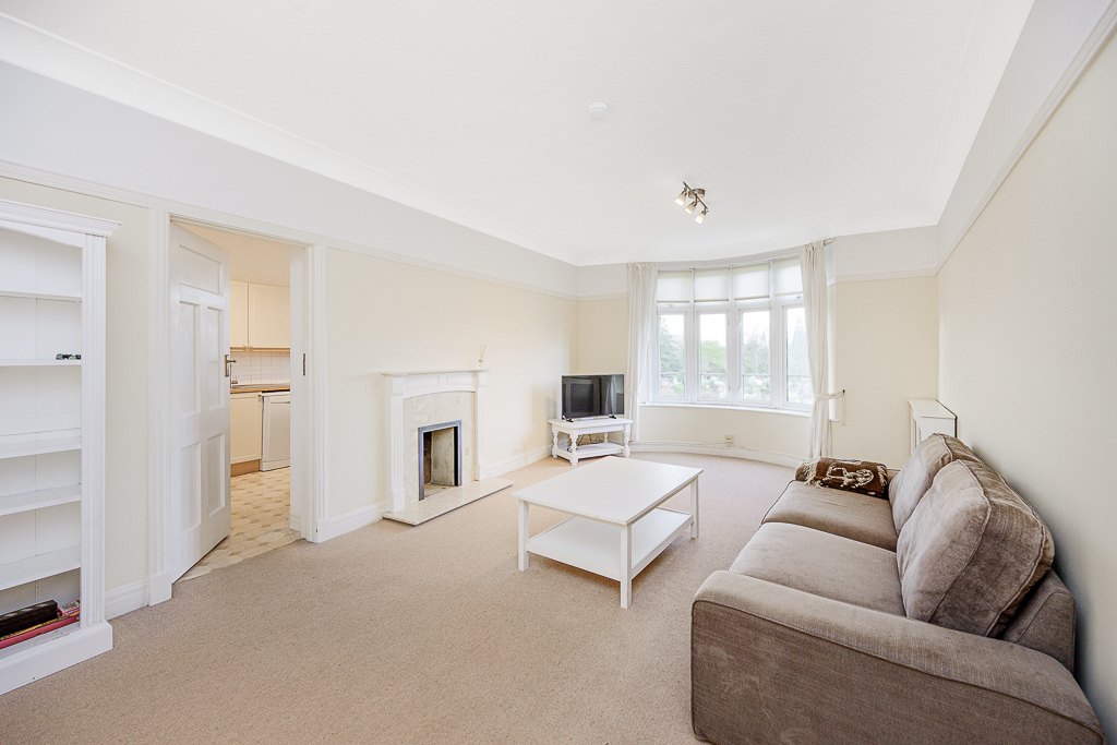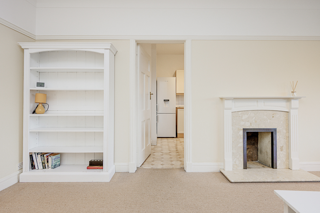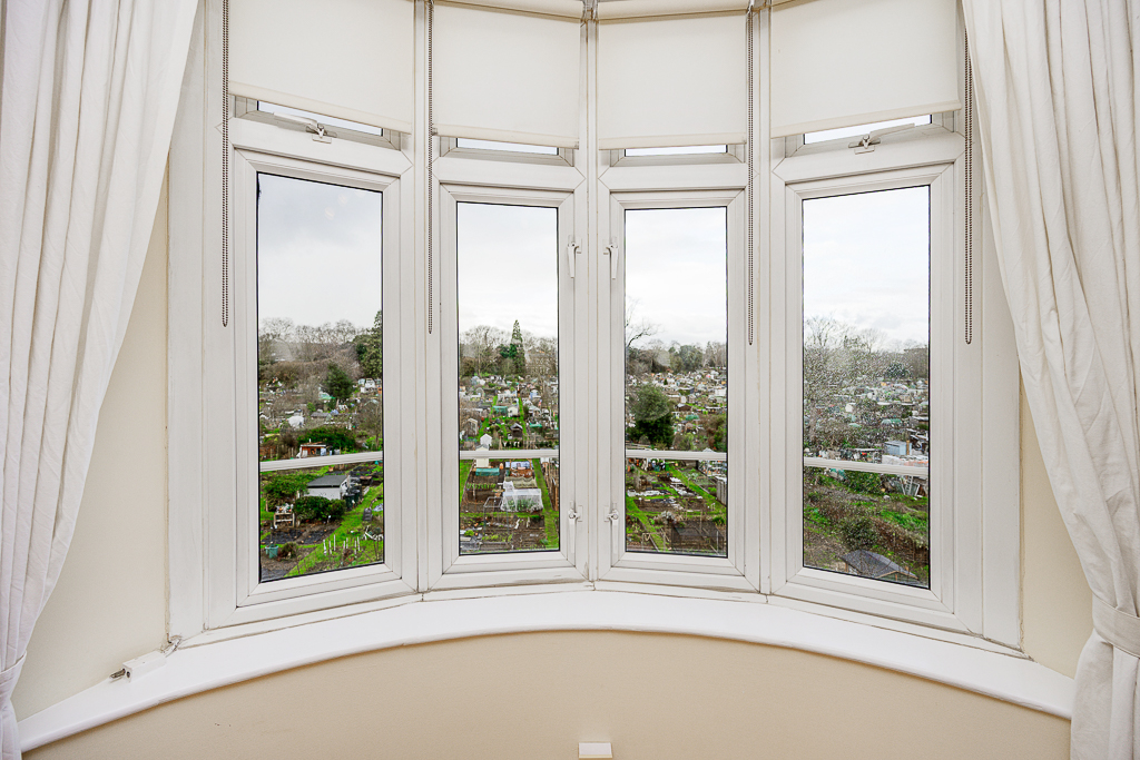 The sitting room is light-filled and inviting, centred around a charming feature fireplace and large bay window that draws in natural light and offers far-reaching views across the allotments and treetops beyond. The generous proportions and neutral décor create a calm, relaxed space to unwind after a day exploring the city.