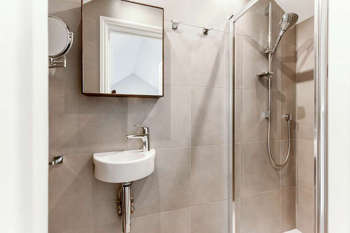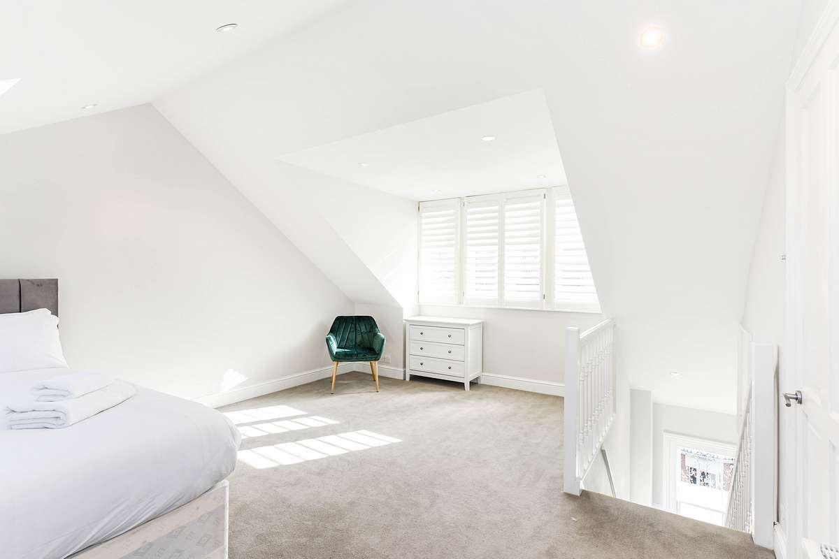 The second floor comprises the spacious master bedroom with a UK king-sized bed (5ft wide) and an ensuite shower with a separate bath. Two further bedrooms, one with a UK king and the second with a UK double bed (4.5ft wide), are serviced by a family bathroom with shower over bath. The third-floor attic bedroom, with a UK king-sized bed (5ft wide), is bright and spacious, with two large skylights and an ensuite shower.