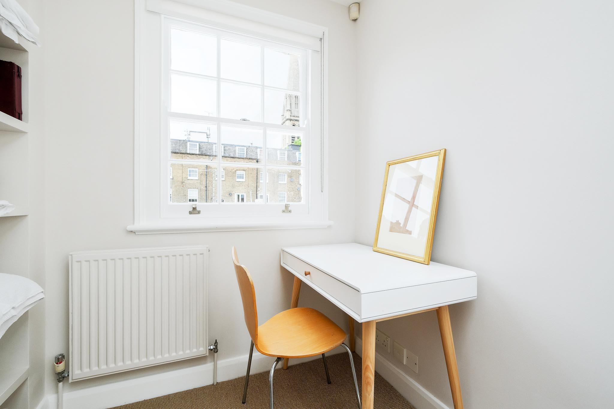 The first floor hosts two spacious bedrooms. The master bedroom features a UK super king-sized bed (6ft wide) and an en suite bathroom complete with a bathtub and standalone shower stall. The second bedroom offers a large UK single bed (3.5ft wide). On the second floor, you’ll find two additional UK double-bed bedrooms (4.5ft wide) and a workspace. These bedrooms are served by a bathroom with a bathtub.