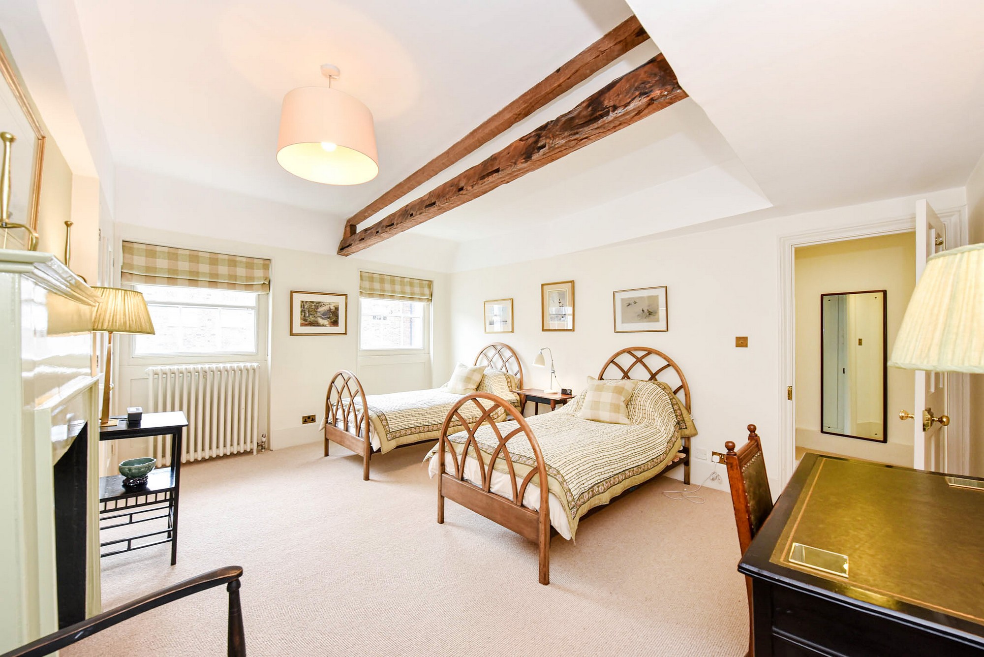 On the third floor, you’ll find a private study with a mezzanine double bed (4.5ft wide) and two bedrooms. The first bedroom features a UK double bed (4.5ft wide) and is connected via an interleading door to a second bedroom with split twin single beds (3ft wide) — ideal for families travelling with children. These rooms share a separate bathroom featuring both a shower stall and a bathtub.
