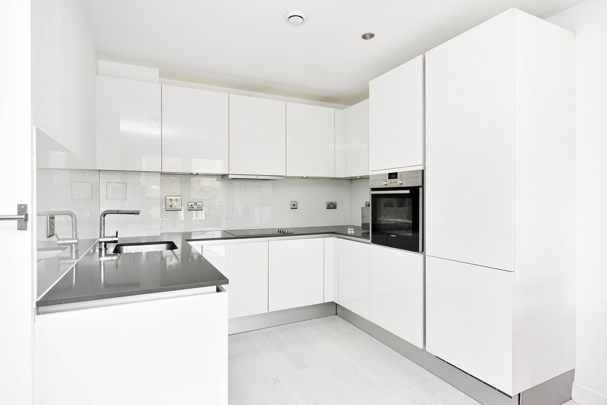 This inviting apartment, located on the 3rd floor of the apartment block, showcases an open-plan living and kitchen area, featuring a comfortable L-shaped sofa and a dining table that can accommodate four. The fully equipped kitchen ensures an unmatched home-away-from-home experience with sleek white cabinets and counters. Natural light floods the heart of the home through large glass balcony doors, which gives rooftop views towards the "Shard", an icon of London's modern skyline.