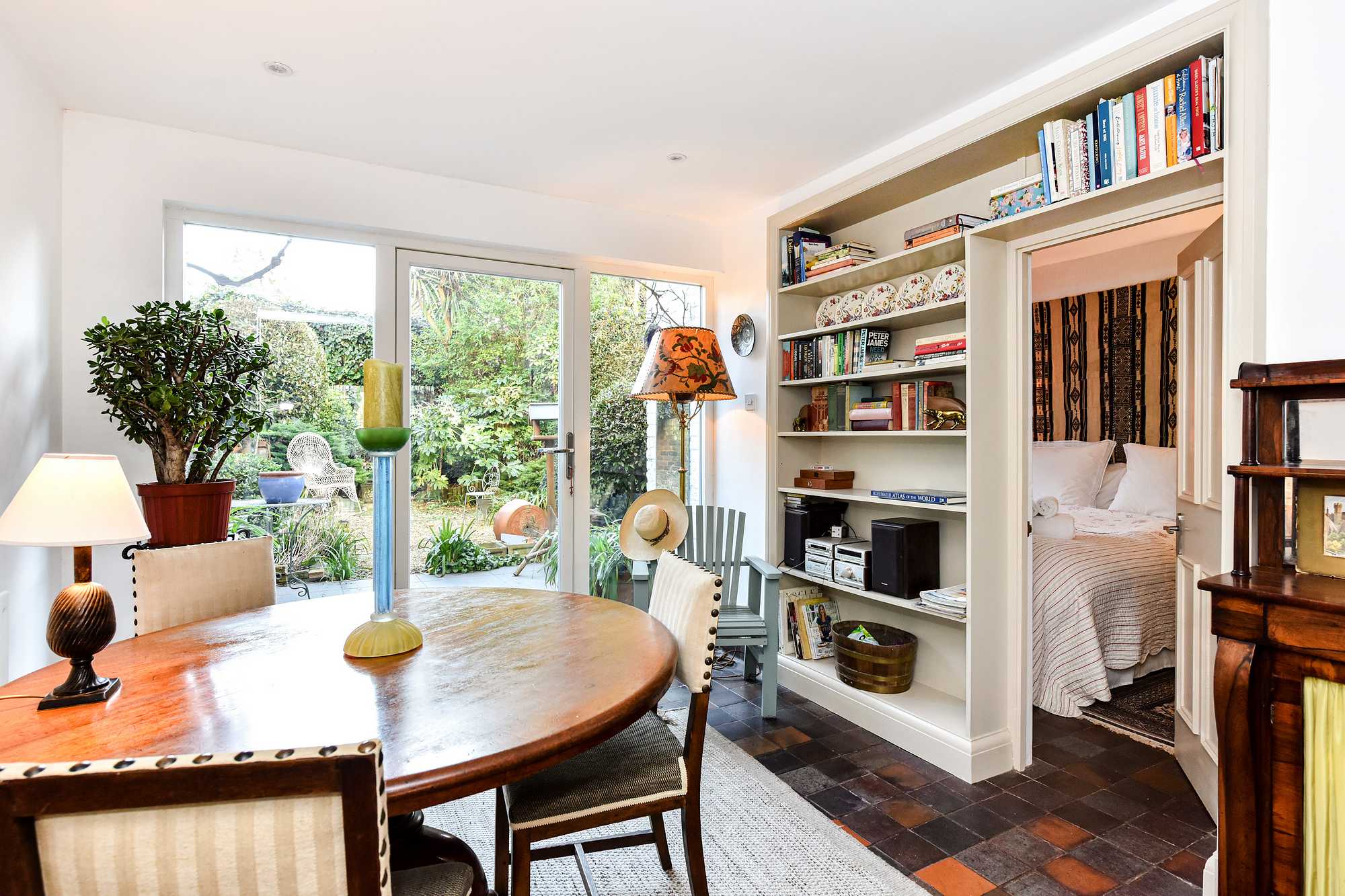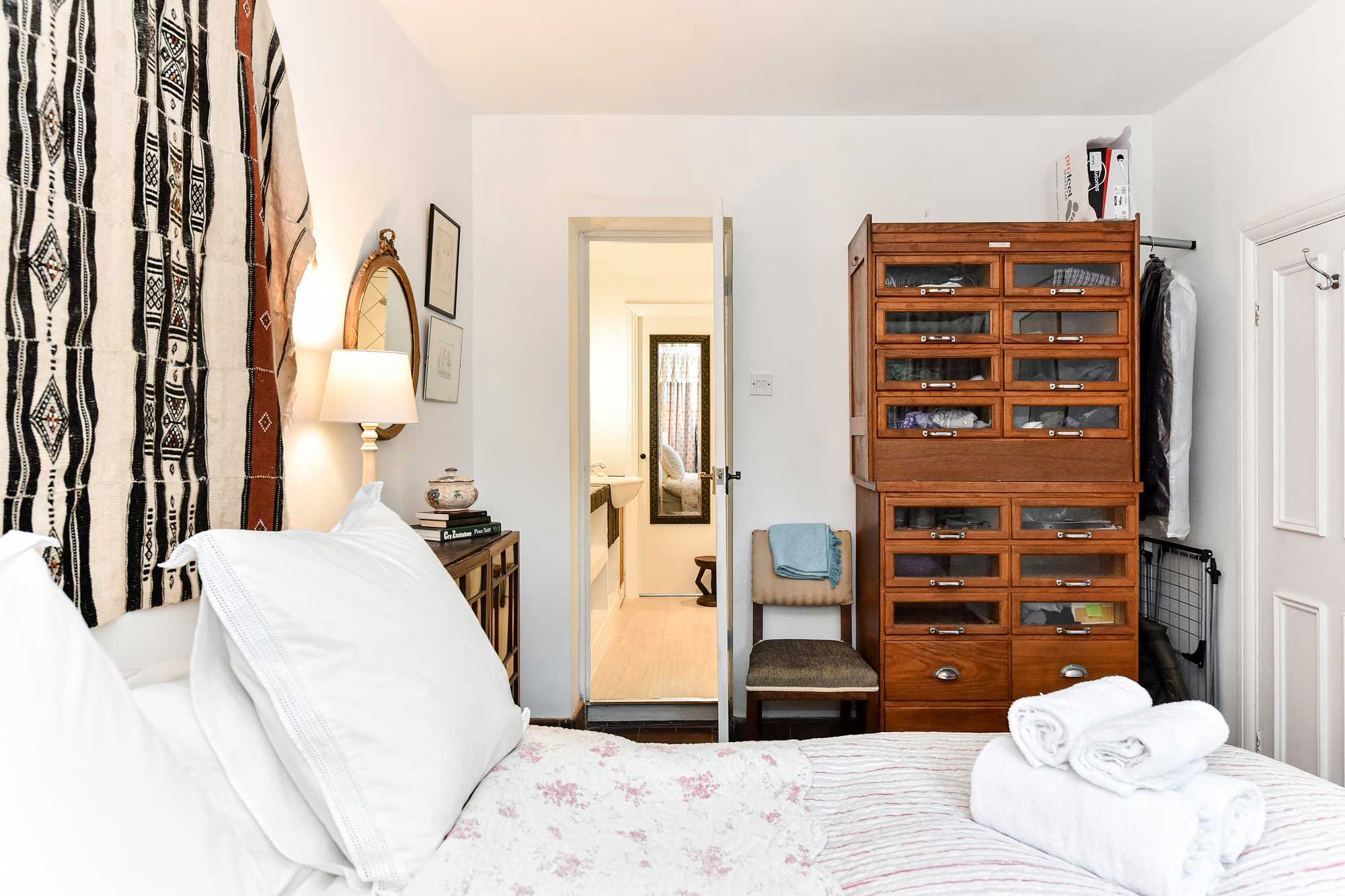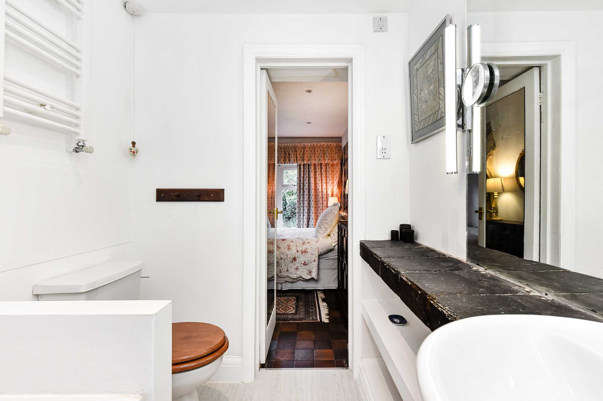 While steps lead you to this lower-ground apartment, the home is laid out over a single floor. Upon entry, you’re welcomed into a bright open-plan kitchen with a unique bar-style countertop and an intimate dining table for two. The cosy living room beckons you from the kitchen, seamlessly flowing into the dining area bathed in natural light from the patio doors. To the right, you’ll find the bedroom equipped with a UK king-sized bed (5ft wide) and further patio doors boasting a view of the garden oasis. This bedroom is serviced by an ensuite bathroom with a shower over the bath and a large vanity mirror. The paved private garden, with patio furniture, is a haven most enjoyed during the warm summer months.
