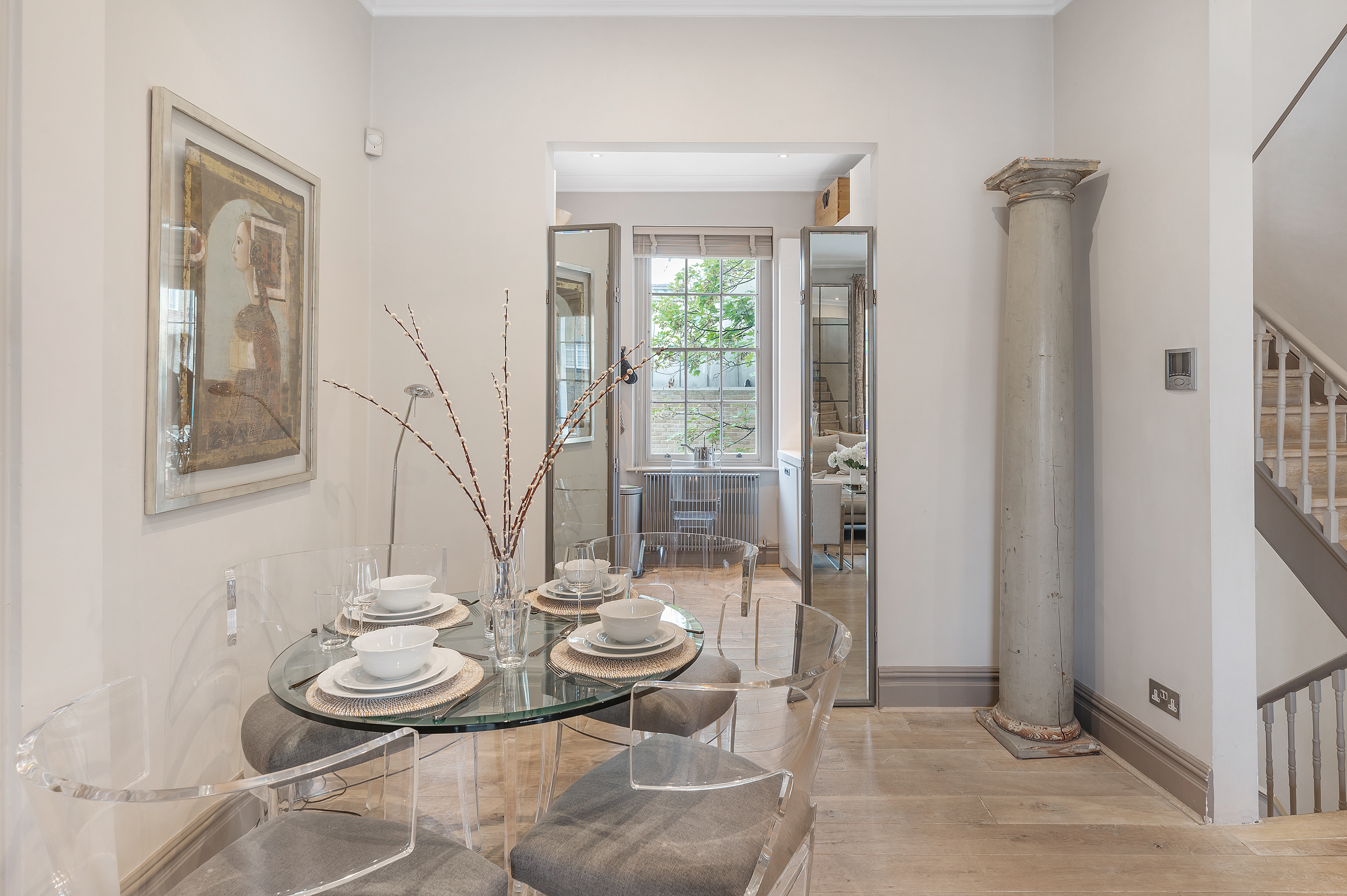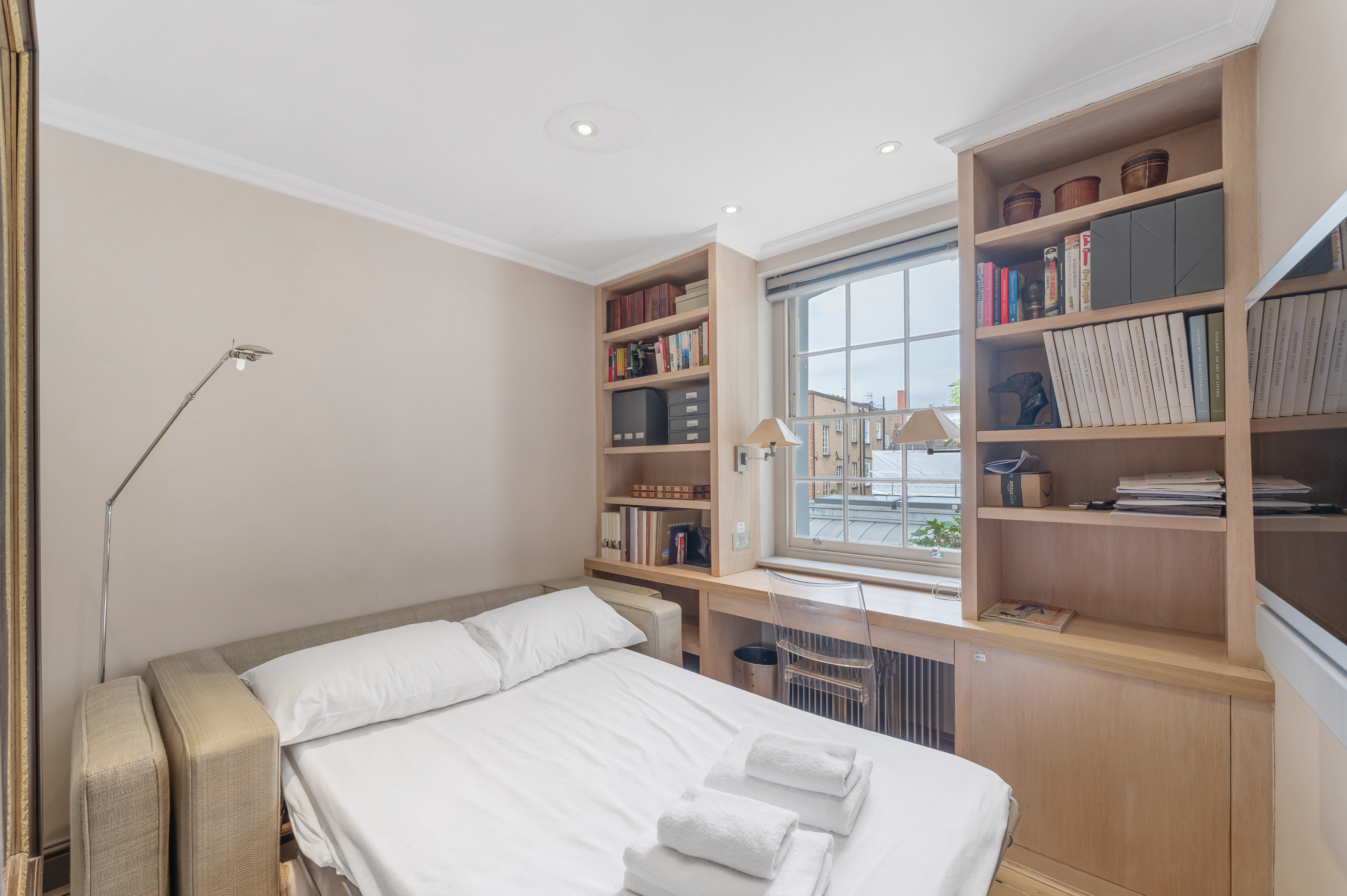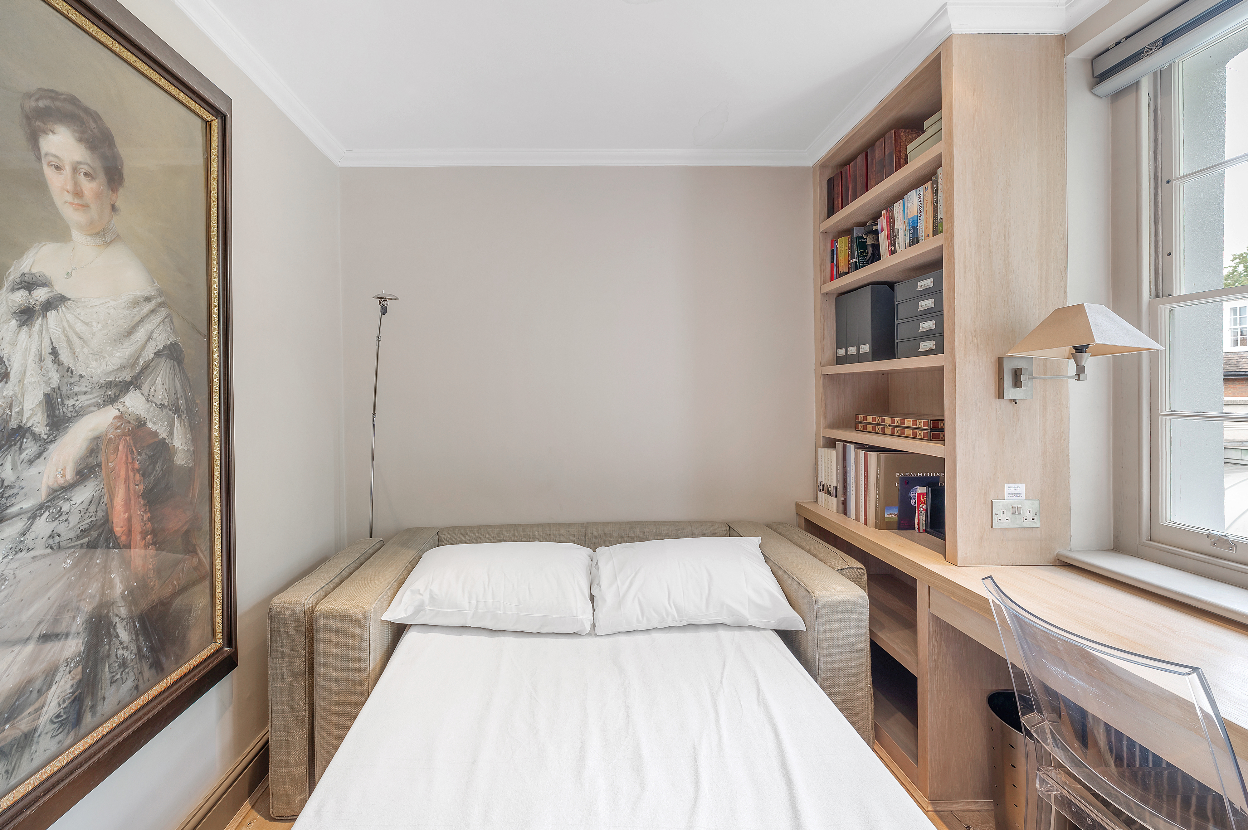 Impeccable taste and a keen eye for interiors come naturally to the owners of Walton Street. They also lead the design behind the magnificent Castello di Reschio estate in Umbria, Italy. The heart of the home is the light-bathed sitting room, dining area and adjoining kitchen. A private garden is accessed down the stairs to the rear of the home, and the bedrooms and bathrooms are spread over a further three levels. The master bedroom has a UK super king (6 ft wide) bed on the third floor. The other bedroom has a UK super king (6 ft wide), and there is also a study with a sofa bed to accommodate an extra adult or 2 x children. Both bedrooms are fitted with portable air conditioners.