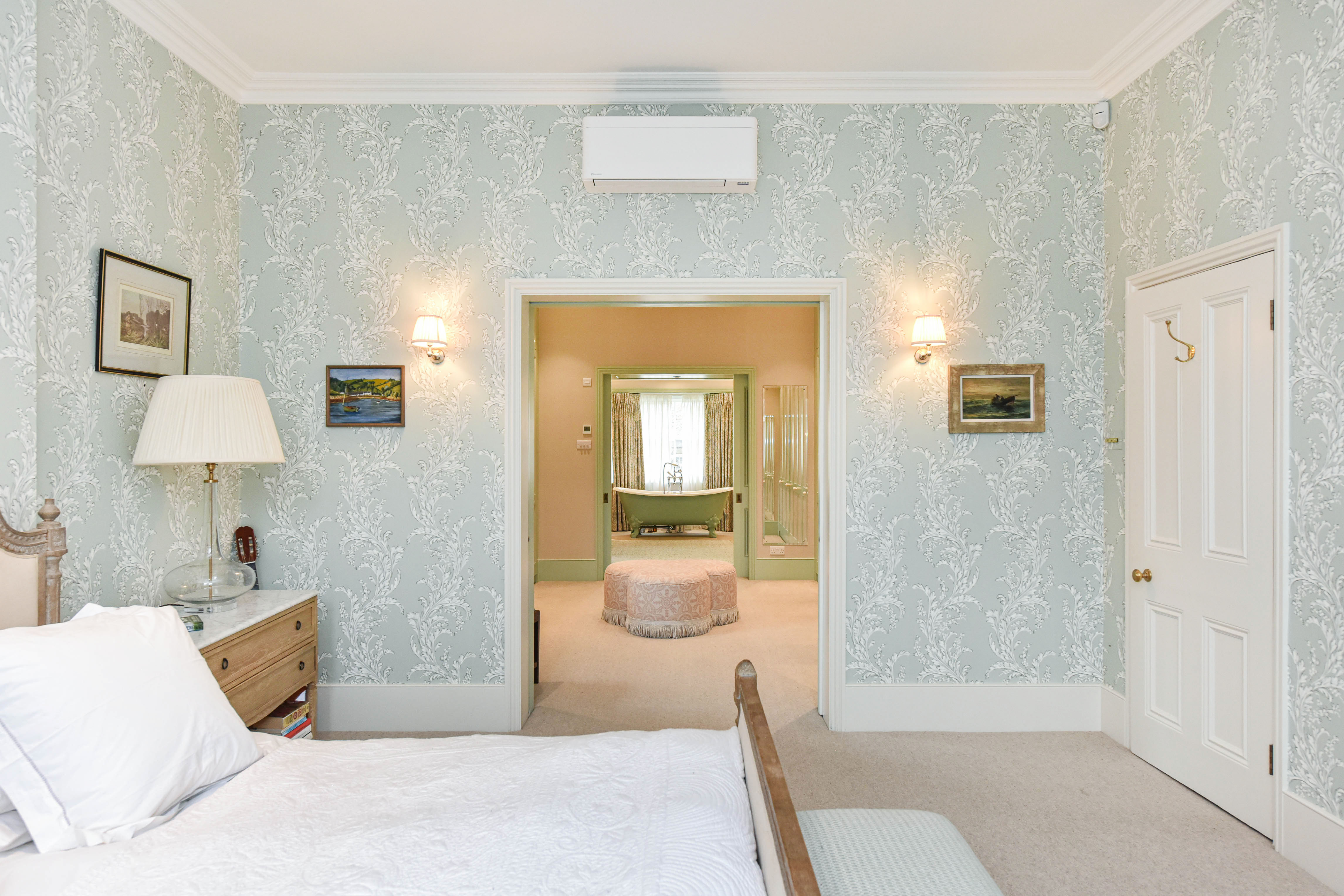 The property spans three floors. The ground floor comprises a magnificent double reception room, a large and light open-plan kitchen and dining room (giving direct garden access), a study and a WC. The first floor hosts the master bedroom (6ft wide super king bed) with a large walk-through closet and an ensuite bathroom (shower stall and bath). A second bedroom, featuring a UK king-sized bed (5ft wide), is served by a separate bathroom with a shower stall. The third bedroom, with a UK king-sized bed (5ft wide), presents an ensuite bathroom with a shower stall. On the third floor, you’ll find two comfortable UK double bedrooms (4.5ft wide). While the second bedroom has an ensuite bathroom featuring a standalone bathtub and a shower stall, a separate bathroom serves the other bedroom. Air conditioning is available in both double bedrooms on the third floor and the master bedroom.