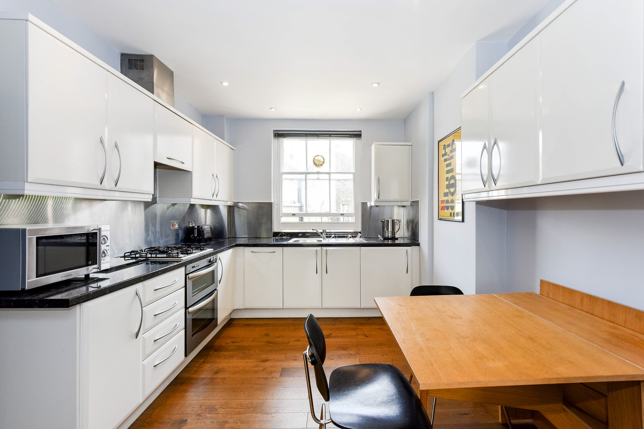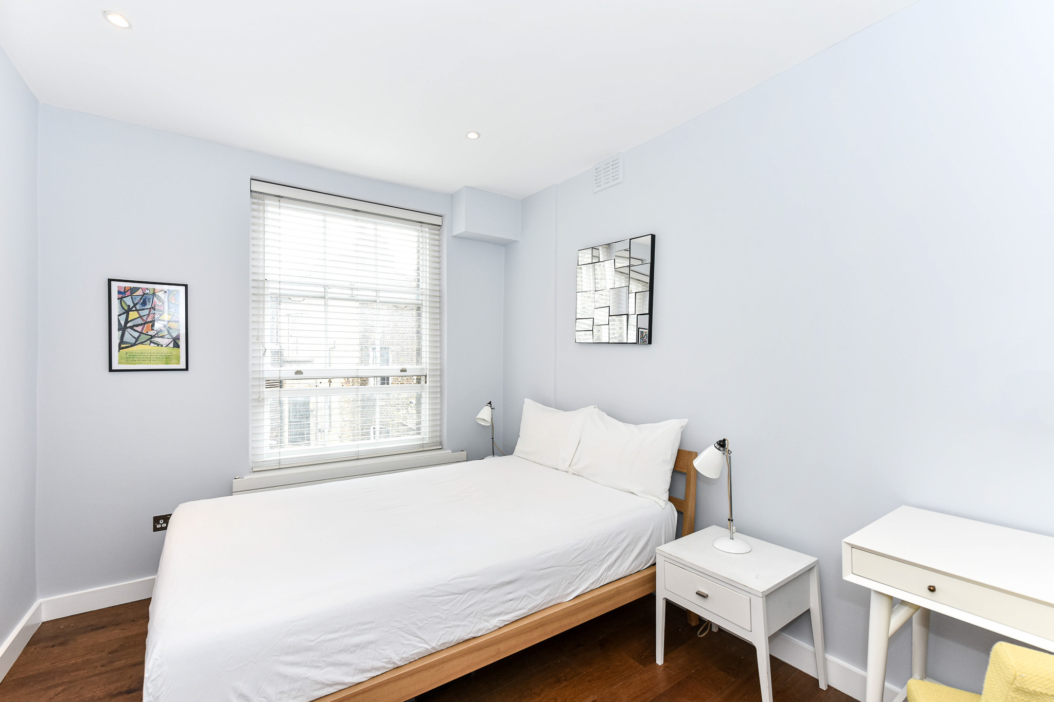 The apartment is located on the second floor of the block, with elevator and stairs access. The master bedroom offers a UK double bed (4.5 ft wide) served by a minimalistic bathroom with a shower. The fully equipped kitchen, which leads into a comfortable living room, has just about anything one would need to enjoy the bounty of London's many markets.